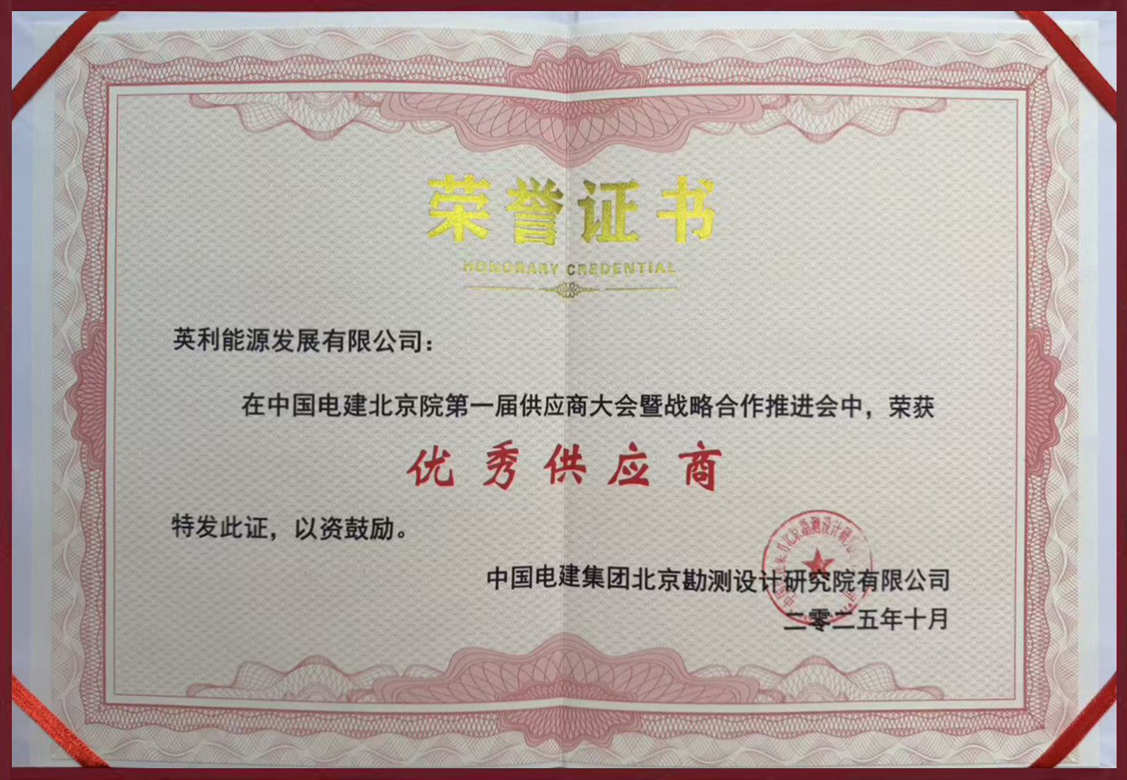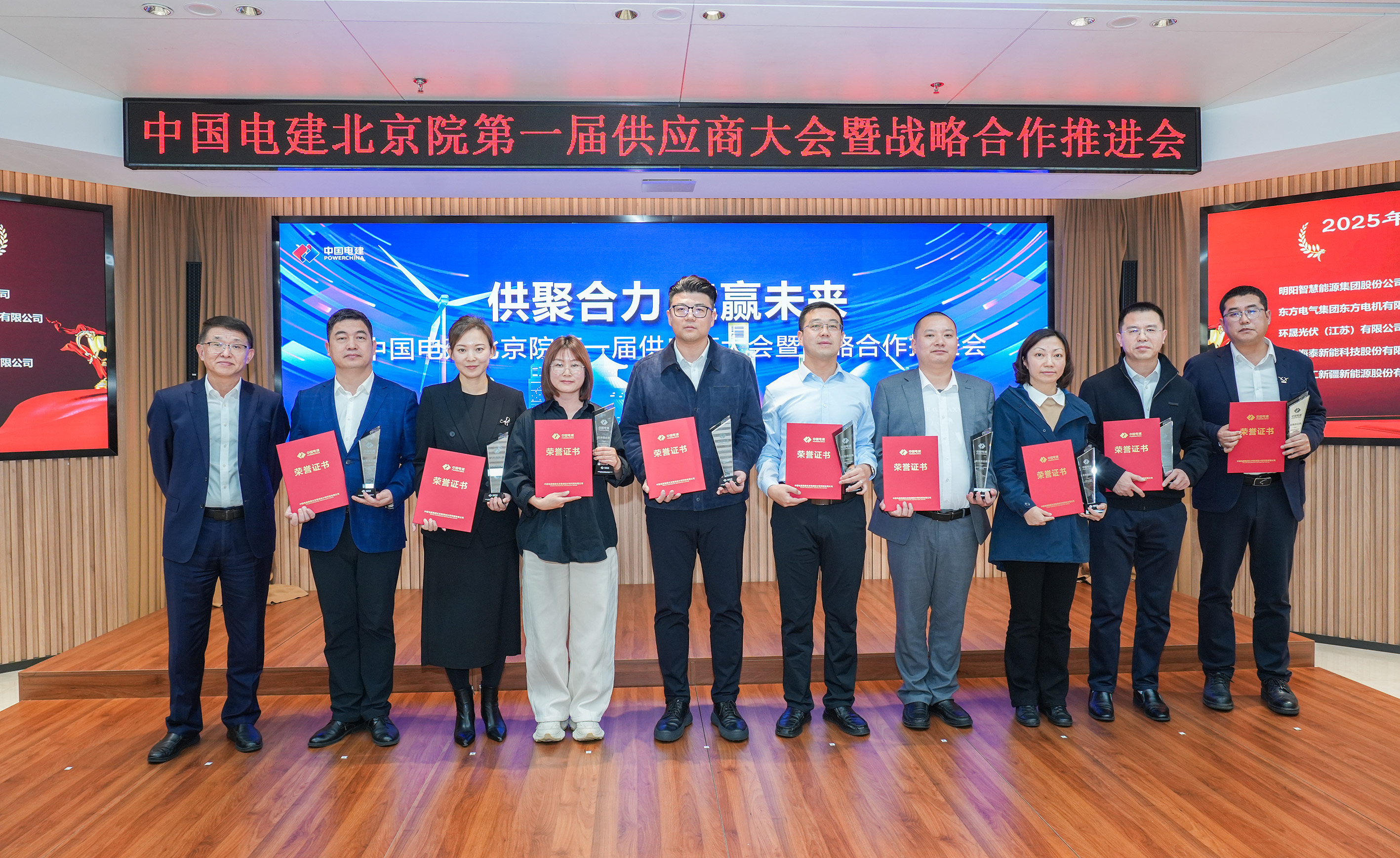 10月23日,中国电建集团北京勘测设计研究院有限公司第一届供应商大会暨战略合作推进会在北京召开。中国电力建设集团有限公司采购中心主任刘庆华、工管部供应链管理处经理吴志襄莅临参会;中国电建北京院党委书记、董事长朱国金以视频形式致欢迎词,党委委员、纪委书记郭华涛,党委委员、副总经理王斌、苟东明,副总经理李建军及百余位供应商代表出席。英利能源发展有限公司受邀参会,并获颁“优秀供应商”荣誉称号。