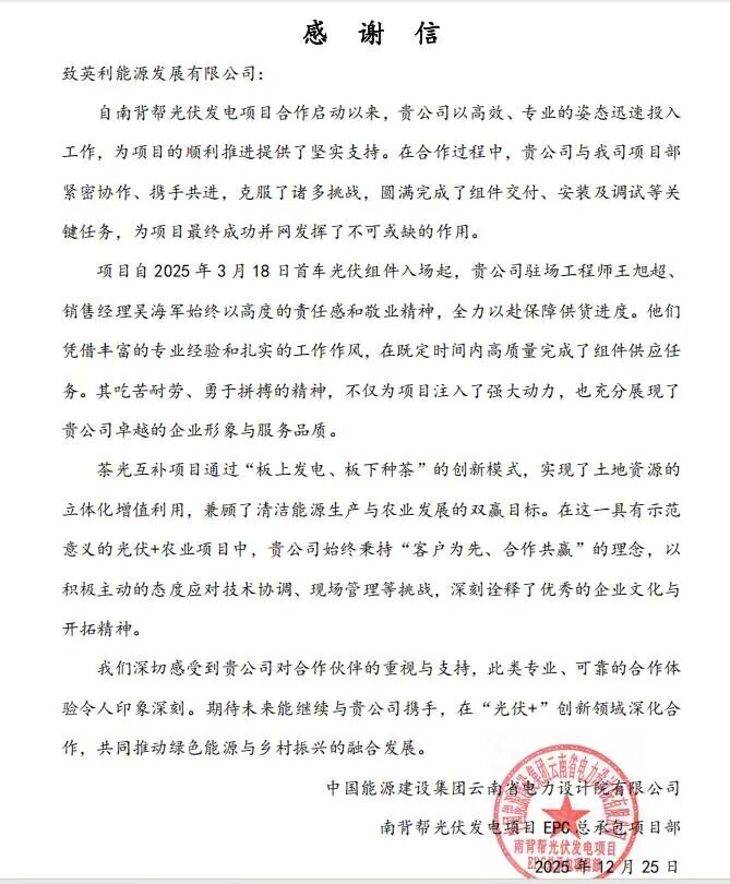 项目全部组件由英利能源发展有限公司提供,得益于英利多年来在场景化应用方面的深耕优势,英利团队克服当地湿热、多雨、泥石流等挑战,提前4个月完成供货,助力这一云南省级重大项目如期实现全容量并网。